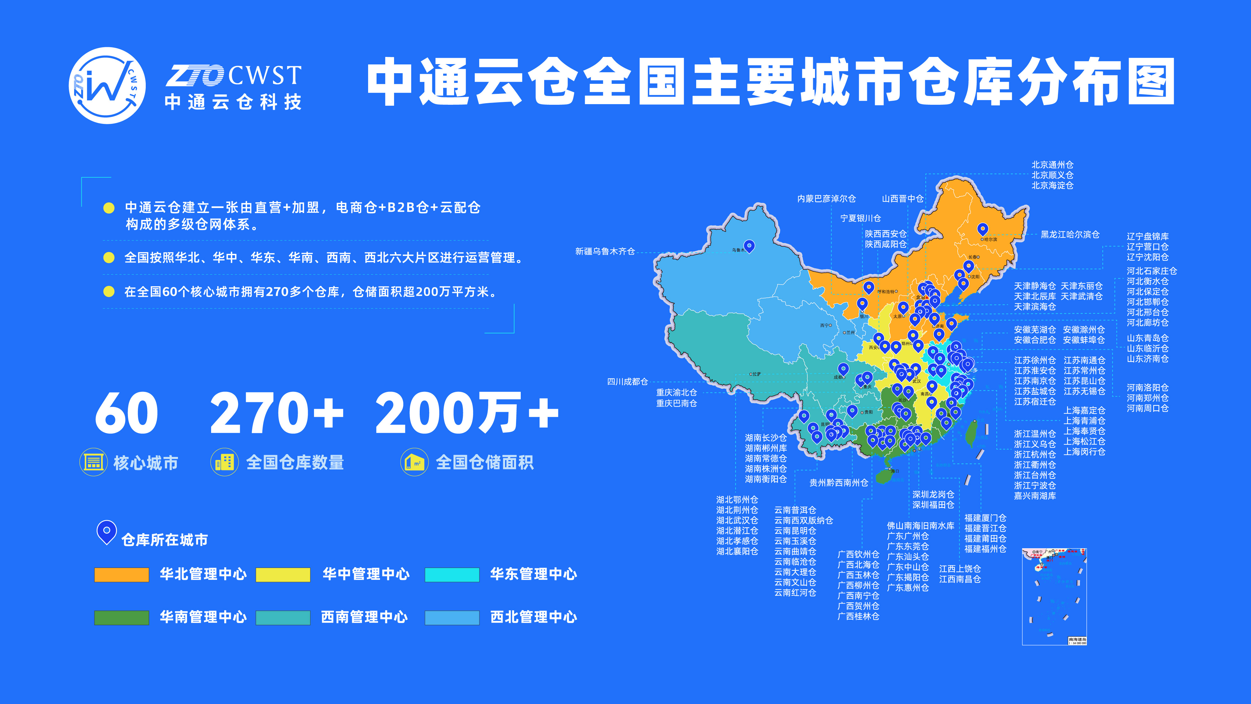 中通云倉(cāng)科技建立了一張由直營(yíng)+加盟,電商倉(cāng)+B2B倉(cāng)+云配倉(cāng)構(gòu)成的多級(jí)倉(cāng)網(wǎng)體系。全國(guó)按照華北、華東、華南、華中、西南、西北六大管理中心進(jìn)行運(yùn)營(yíng)管理。在全國(guó)60個(gè)核心城市擁有270多個(gè)倉(cāng)庫(kù),倉(cāng)儲(chǔ)面積超200萬(wàn)平方米。了解更多